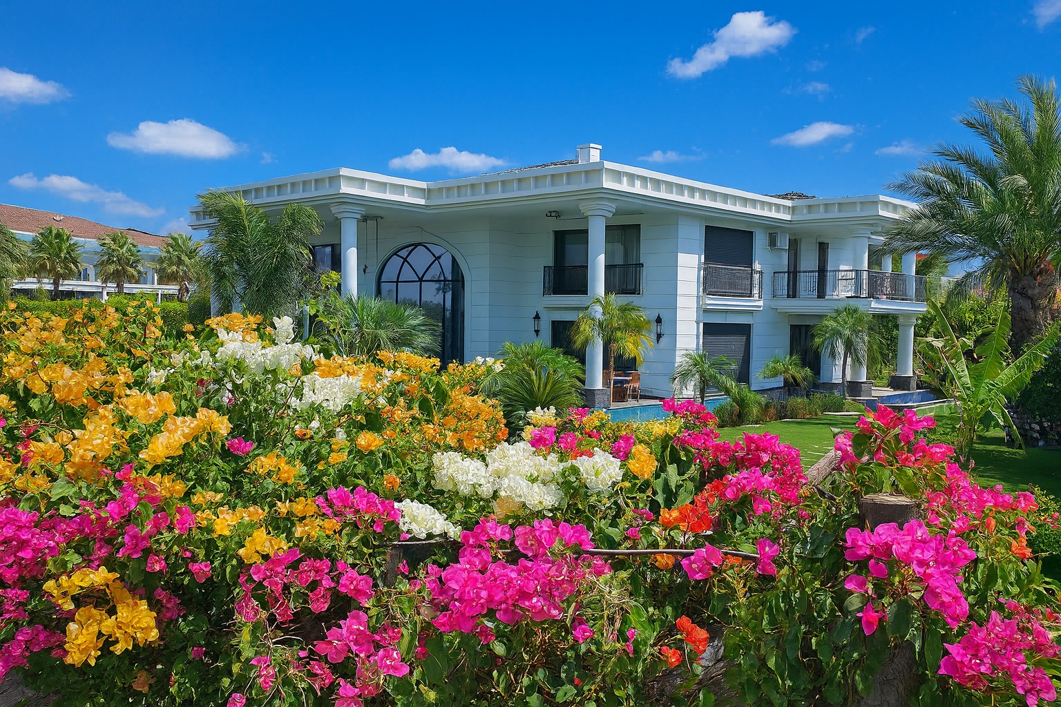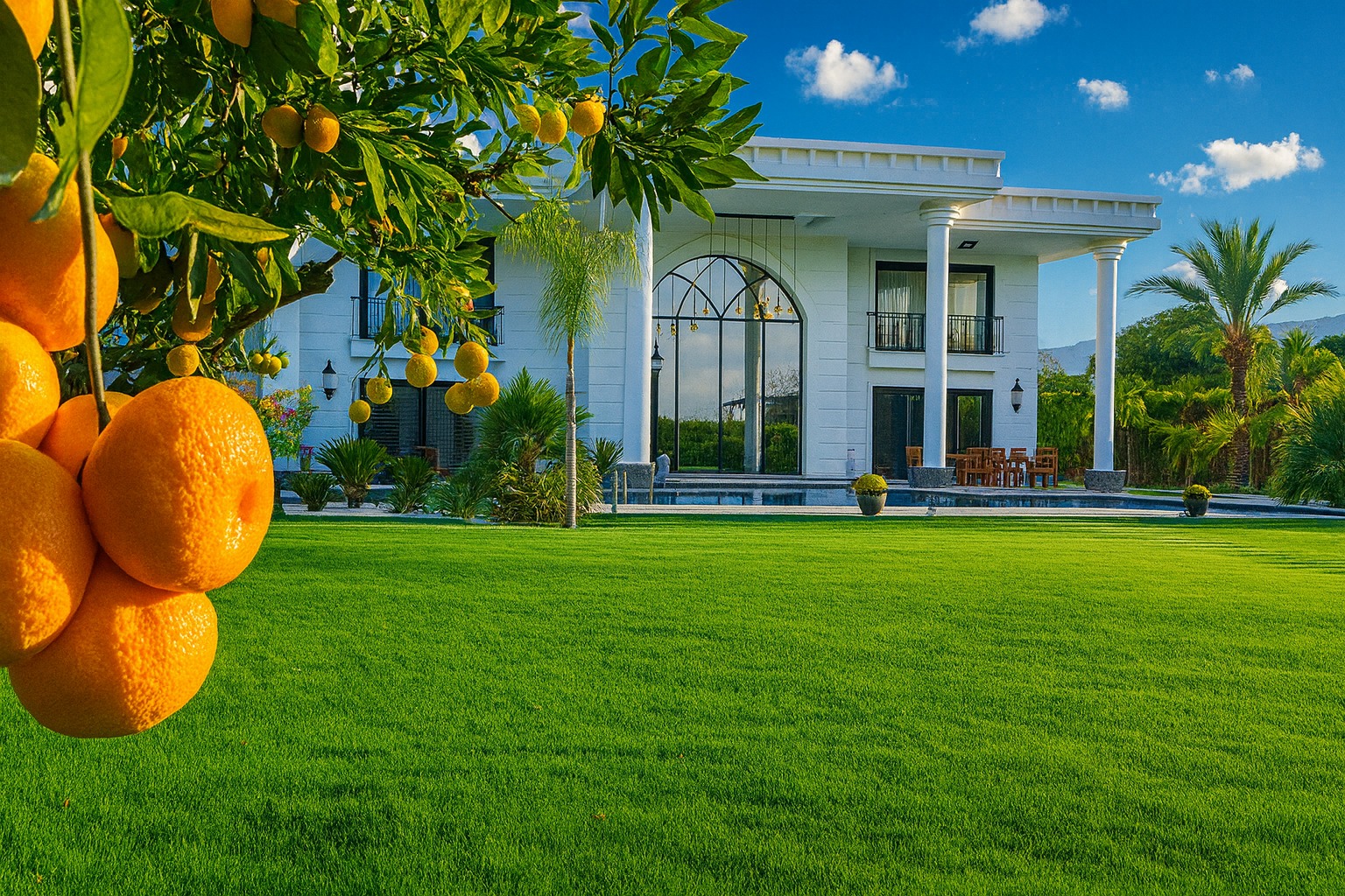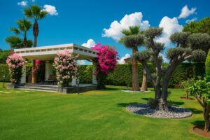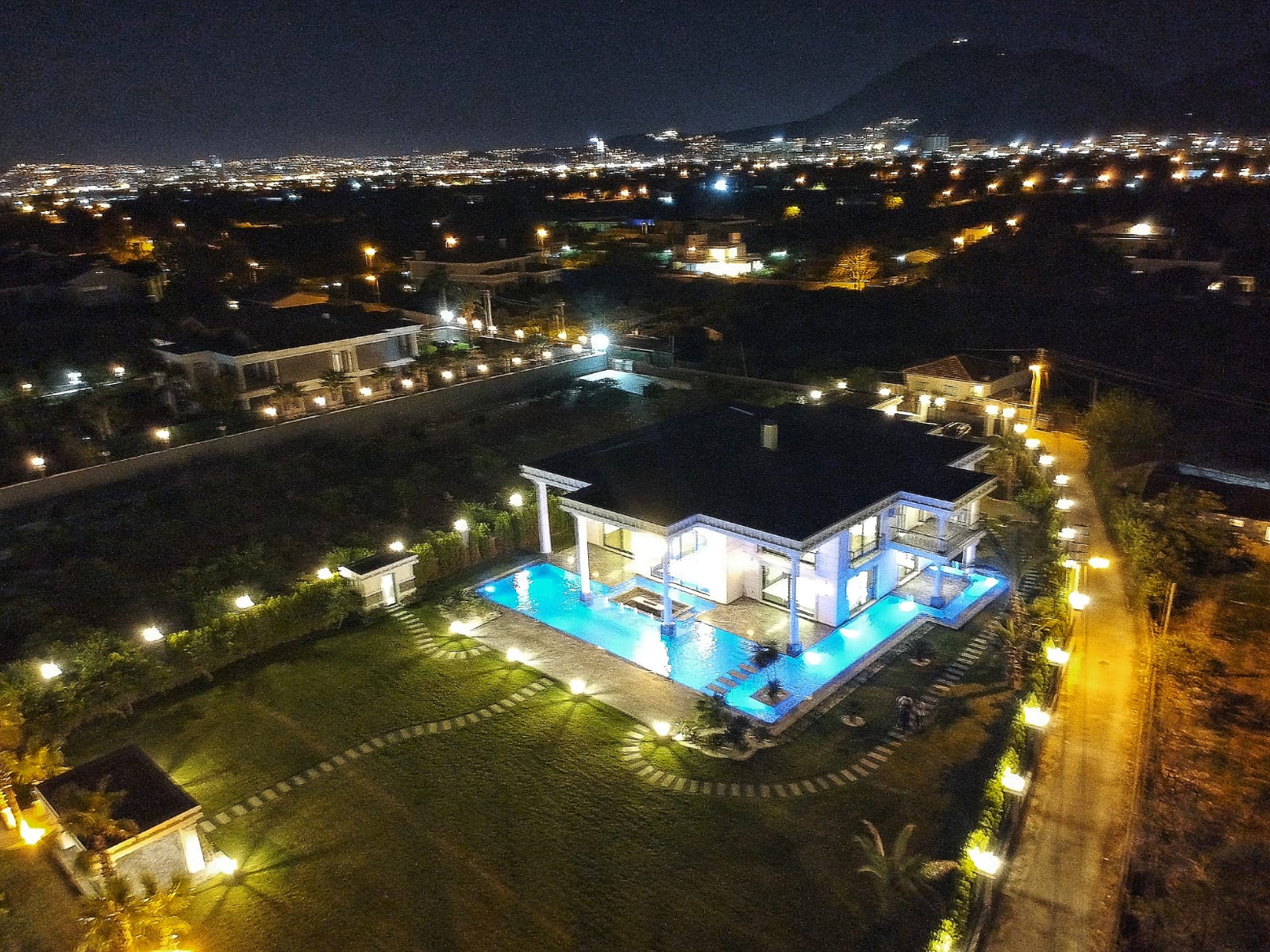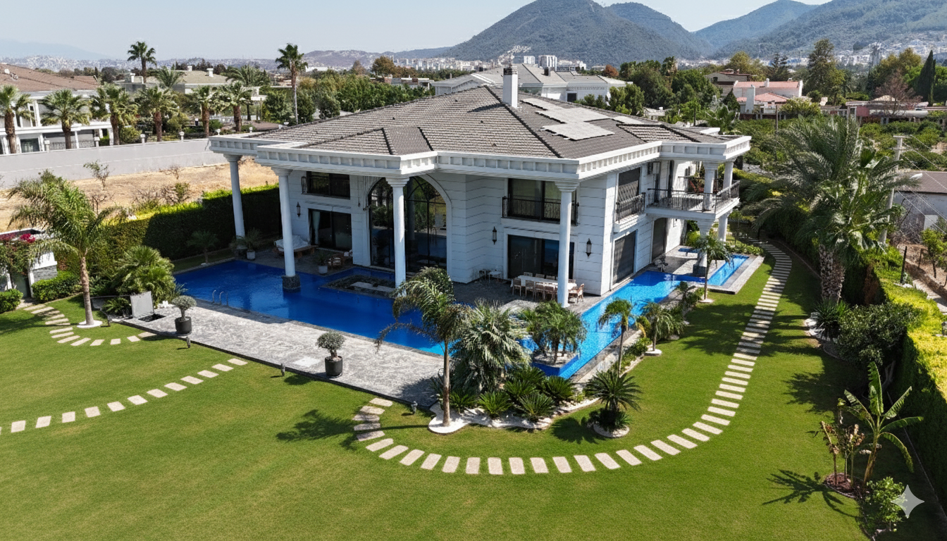 Egzotik palmiyeler, Robellini, Cocos, Sycas, Starlice, Yuka ve diğerleriyle profesyonel bir peyzaj düzenine sahip olan bahçede; villanın iki tarafını saran 600 tonluk L tipi sonsuzluk havuzu yer almaktadır. Bahçe tasarımı; rengarenk begonviller, eşine az rastlanır güzellikte bonzai zeytin ağaçları ile profesyonel, minimalist ve özel bir tasarım sunmaktadır. Bahçe pergolası, yürüyüş yolları, aydınlatmalar, olgun bitkiler ve mis gibi kokan mandalina çiçekleriyle kaplı bu malikane 3.095 metrekare toplam alan üzerine kuruludur. İki katlı dubleks yapısı 800 metrekare kullanım alanına sahip olup 4,5 yıllıktır.