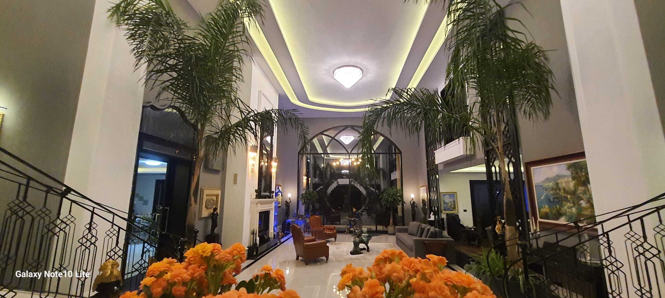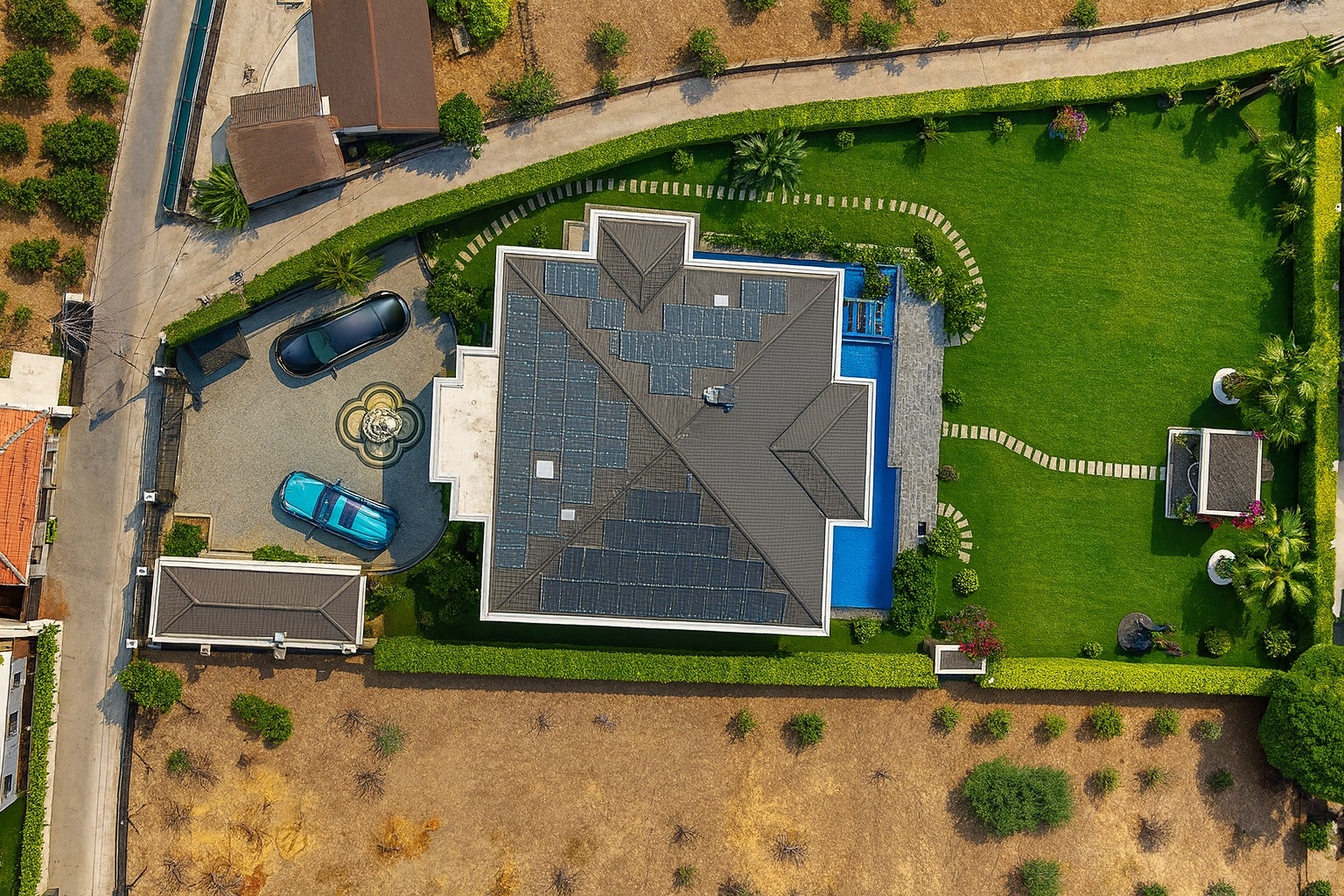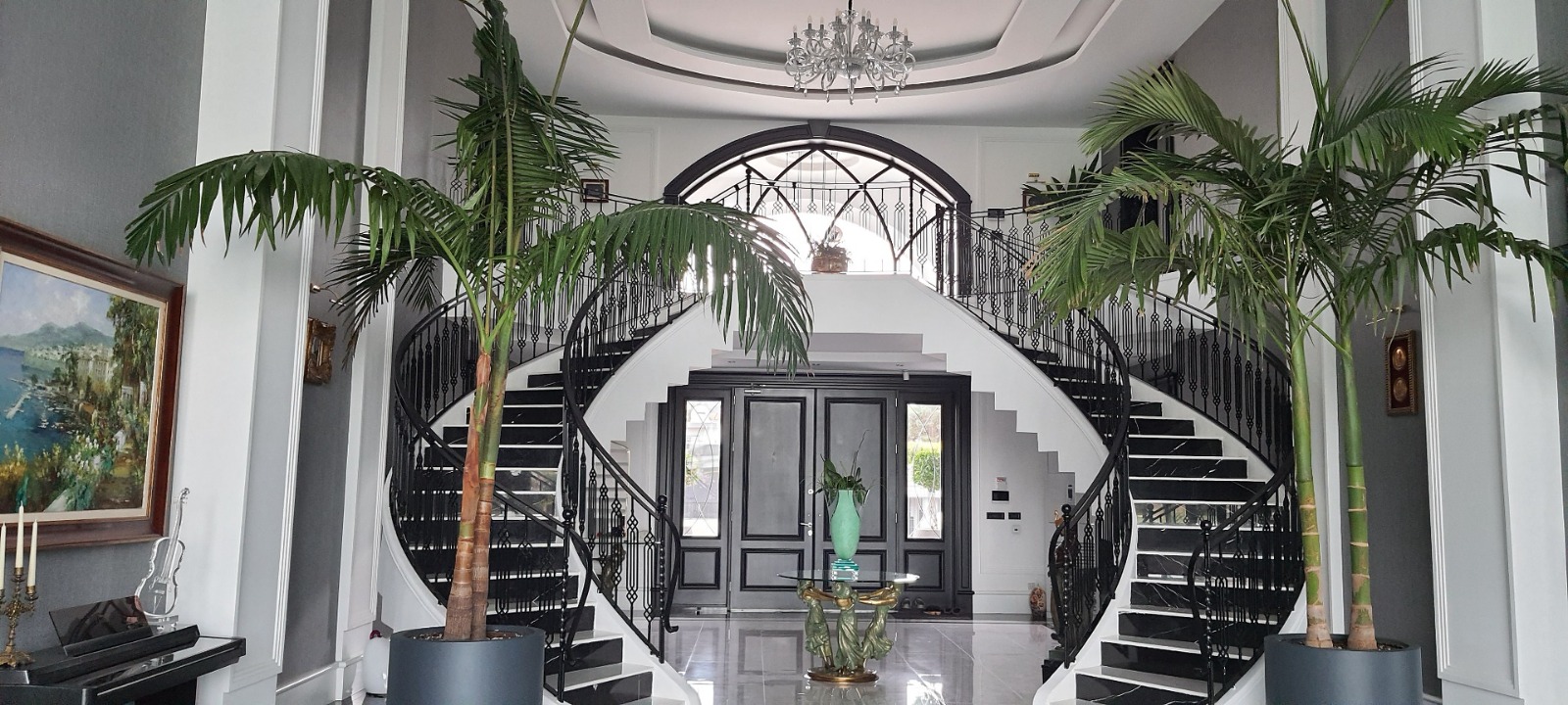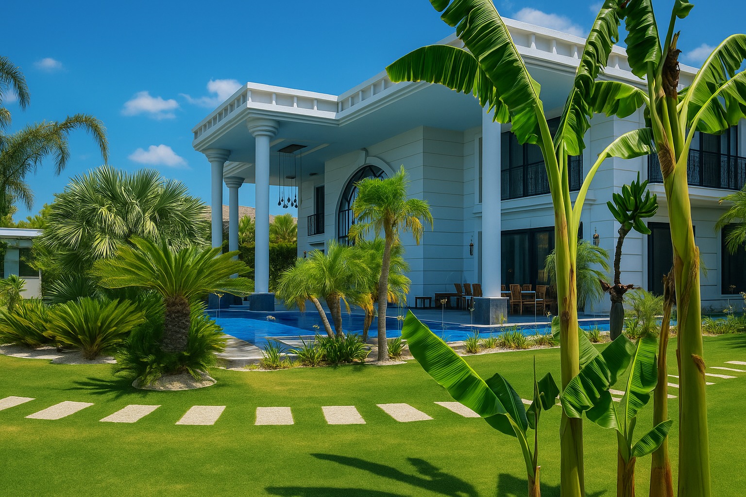 Egzotik palmiyeler, Robellini, Cocos, Sycas, Starlice, Yuka ve diğerleriyle profesyonel bir peyzaj düzenine sahip olan bahçede; villanın iki tarafını saran 600 tonluk L tipi sonsuzluk havuzu yer almaktadır. Bahçe tasarımı; rengarenk begonviller, eşine az rastlanır güzellikte bonzai zeytin ağaçları ile profesyonel, minimalist ve özel bir tasarım sunmaktadır. Bahçe pergolası, yürüyüş yolları, aydınlatmalar, olgun bitkiler ve mis gibi kokan mandalina çiçekleriyle kaplı bu malikane 3.095 metrekare toplam alan üzerine kuruludur. İki katlı dubleks yapısı 800 metrekare kullanım alanına sahip olup 4,5 yıllıktır.