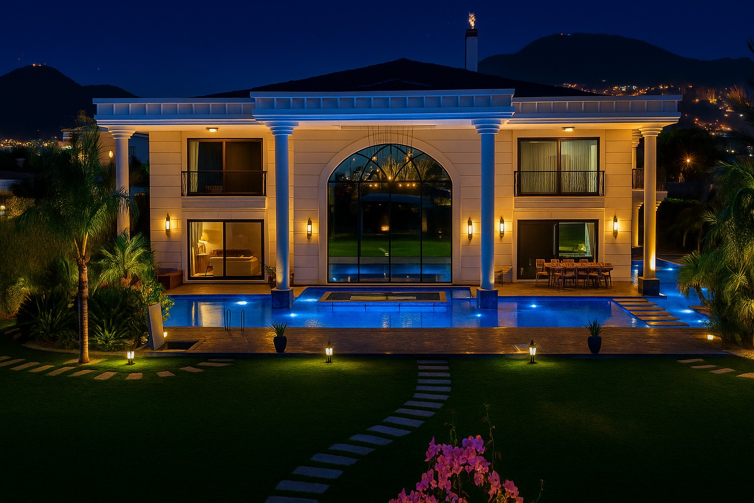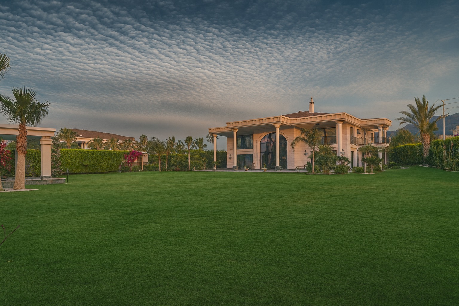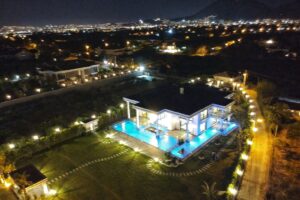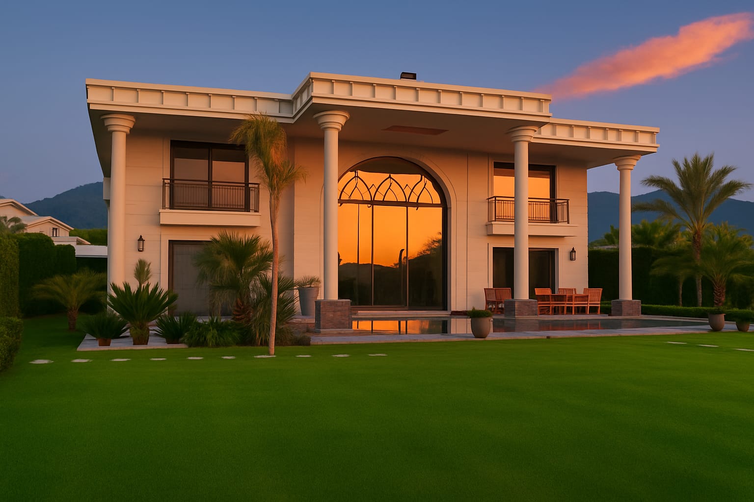 Bu villa yalnızca bir konut değil bir yaşam eseri. Ege’nin büyüleyici gün batımları, zarif mimari çizgiler ve doğayla bütünleşen bir yaşam tarzı sunuyor. Mimari zerafet, doğayla uyum, konfor ve güvenlik eksiksiz şekilde bir araya getirilmiş. Gün doğumunda mandalina bahçelerinin kokusuyla uyanmak, gün batımında güneşin pembemsi yansımalarını izlemek, Ege’de lüks yaşamın en özel tanımı tam olarak budur. Zamanın ötesinde bir yaşam alanı olan bu yapı, Neoklasik-modern Akdeniz/Miami tarzı yüksek sütunları, büyük kemerli cephe camları ve simetrik yapısıyla güçlü bir rezidans ve malikane görünümüne sahiptir.