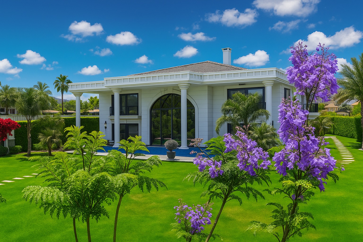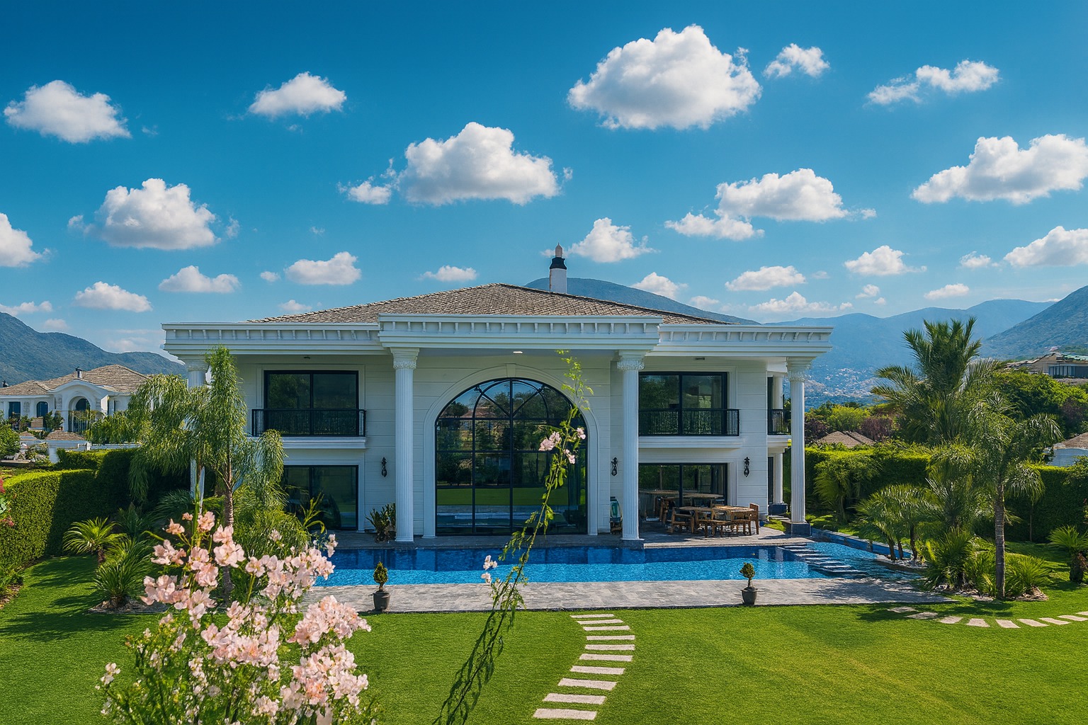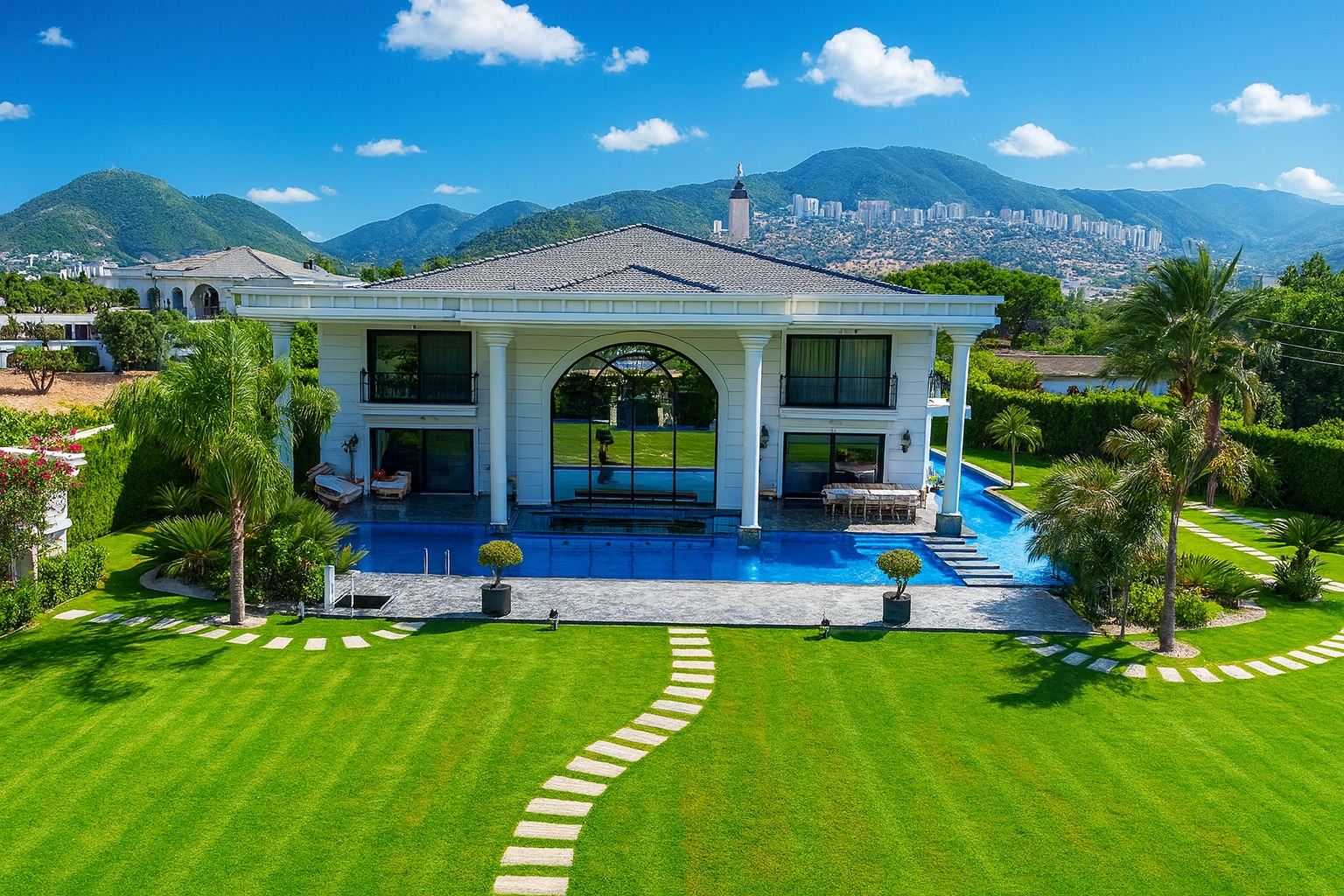 Bu villa yalnızca bir konut değil bir yaşam eseri. Ege’nin büyüleyici gün batımları, zarif mimari çizgiler ve doğayla bütünleşen bir yaşam tarzı sunuyor. Mimari zerafet, doğayla uyum, konfor ve güvenlik eksiksiz şekilde bir araya getirilmiş. Gün doğumunda mandalina bahçelerinin kokusuyla uyanmak, gün batımında güneşin pembemsi yansımalarını izlemek, Ege’de lüks yaşamın en özel tanımı tam olarak budur. Zamanın ötesinde bir yaşam alanı olan bu yapı, Neoklasik-modern Akdeniz/Miami tarzı yüksek sütunları, büyük kemerli cephe camları ve simetrik yapısıyla güçlü bir rezidans ve malikane görünümüne sahiptir.